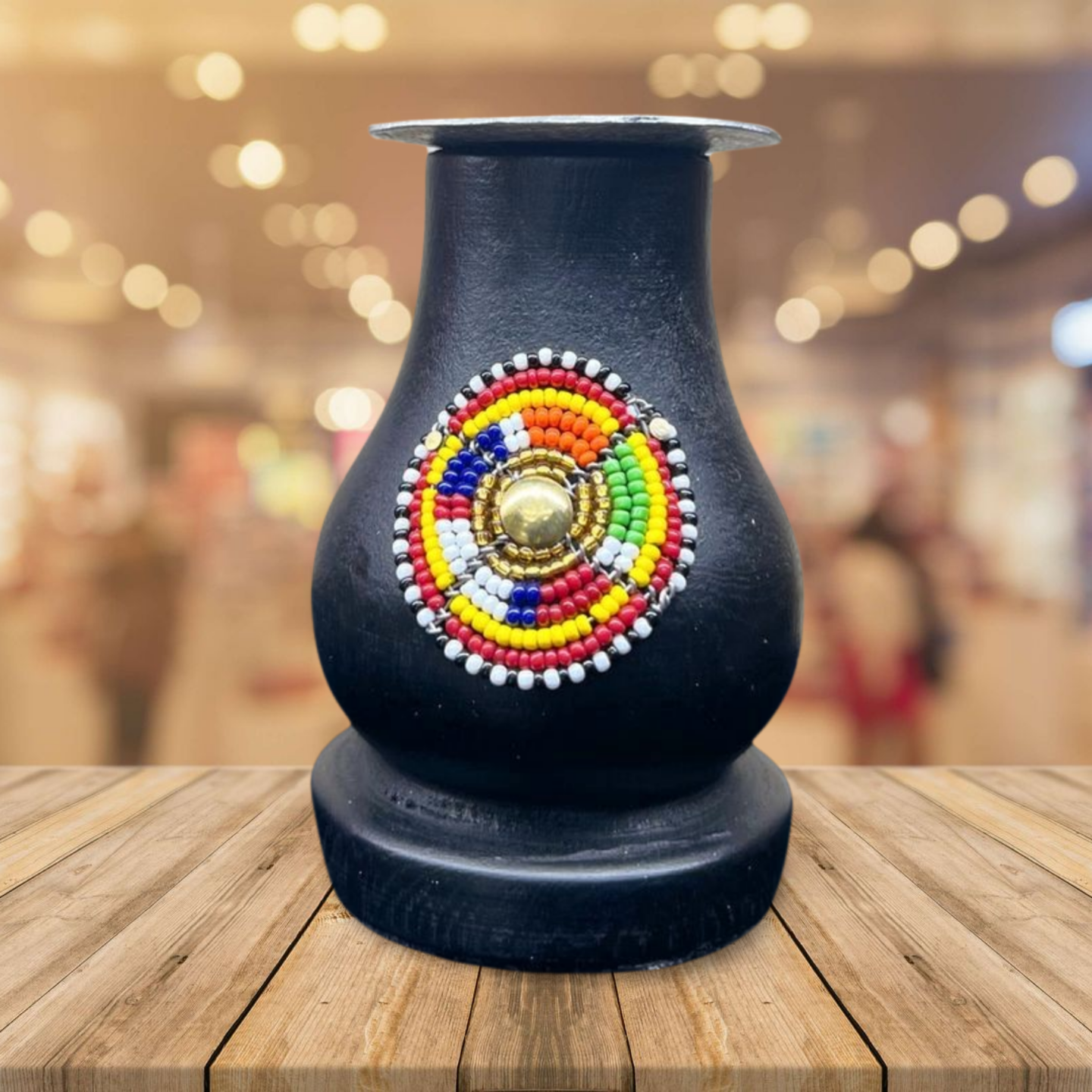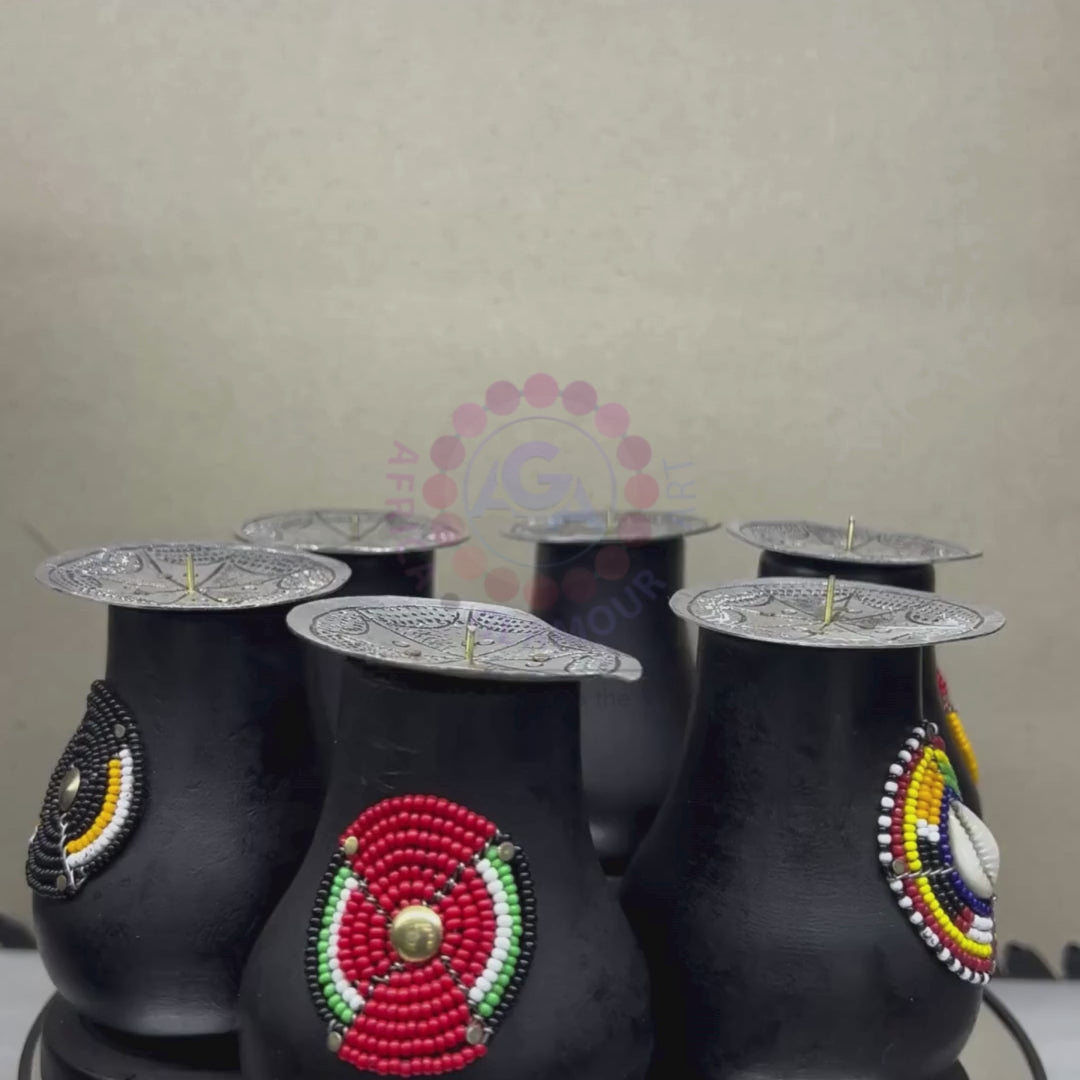 This African-themed wooden candle stand, adorned with intricate beadwork, is a stunning addition to any home décor. Its earthy, handcrafted design brings a sense of warmth and authenticity, making it the perfect centerpiece for your living space or dining area. The blend of wood and colorful beads adds a unique cultural touch, creating an inviting atmosphere that reflects African heritage and craftsmanship.