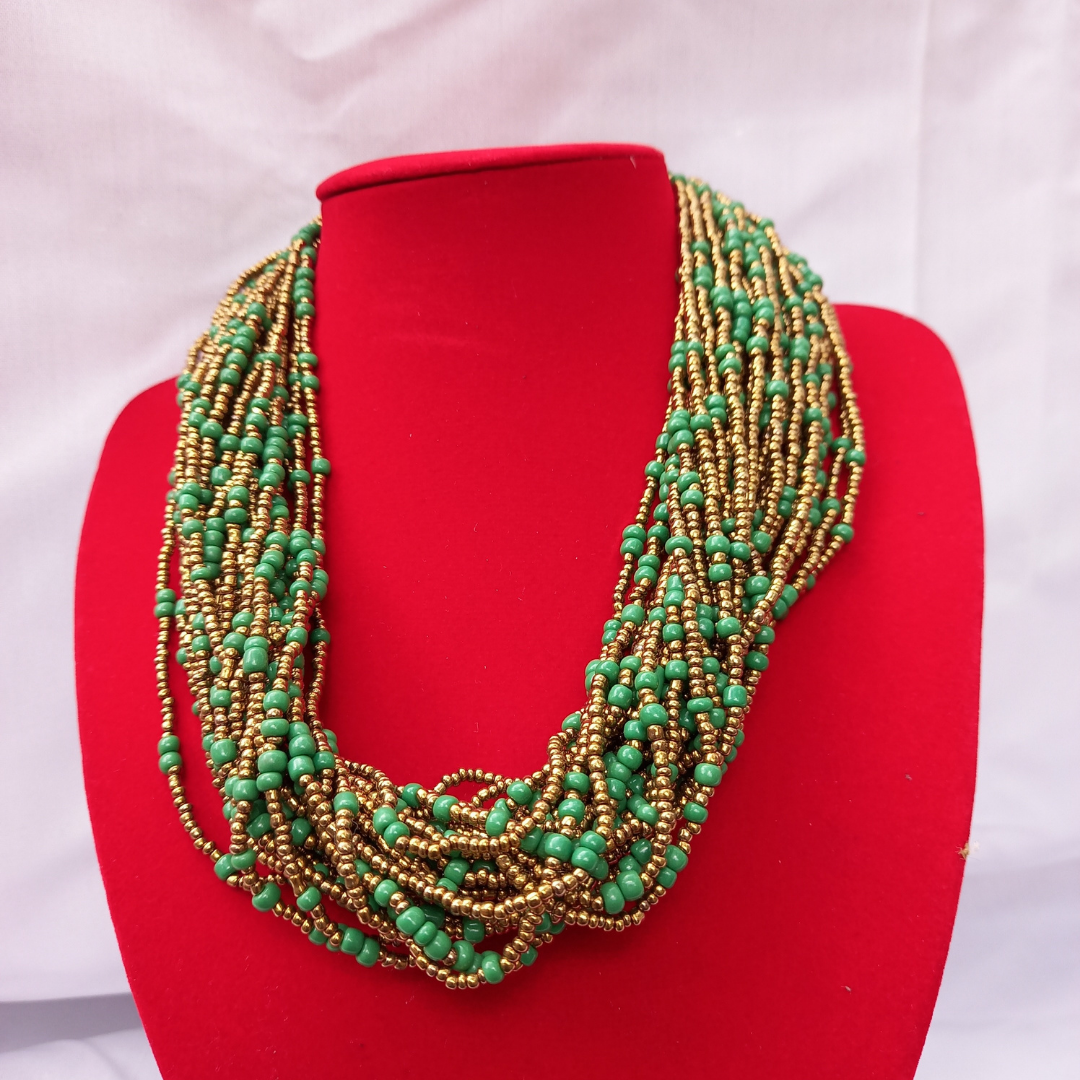 This African Beaded Necklace is a versatile and stylish accessory that can easily elevate any outfit. Handcrafted with traditional African beads, it adds a touch of cultural authenticity to your ensemble. Wear it as a single long necklace. Perfect for expressing your style and supporting African artisans.